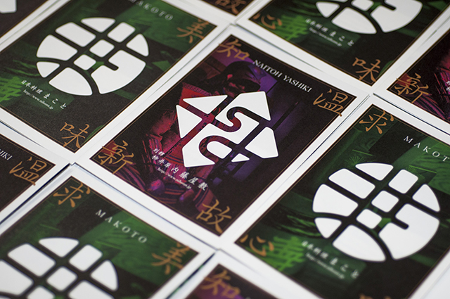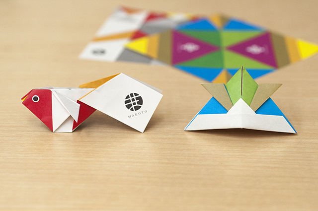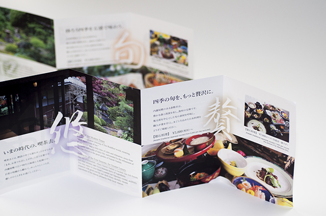 | 日本料理まこと・別館内藤屋敷リーフレット 外国人旅行者にも対応した英語記載のリーフレット。 外国人に日本料理の良さとアトラクションとして武家屋敷での食事を魅力的に伝えるため、和の伝統模様、日本庭園、漢字を随所に盛り込みデザインした。 サイズは、パスポートサイズに設定し、旅行の思い出としていつまでもとっておけるよう配慮した。 d,p 池上陽二朗 cl 株式会社まこと ✔ 包装資材提供 ✔ ロゴ/シンボルマーク | ![]() ![]() ![]() 箸置きになる折り紙は、外国人向けの折り紙体験にも |