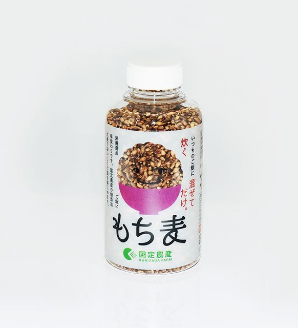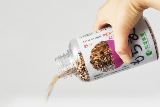 穀類はスタンドパックなどの販売が多く、ボトルタイプのものがありませんが、持ちやすく、スプーンいらずの計量でご飯に混ぜて炊くだけというスタイルを提案しました。デザインも、お椀に盛ったご飯部分からもち麦が見え、こちらに笑いかけている姿にし、思わず手に取りたくなるようにしました。