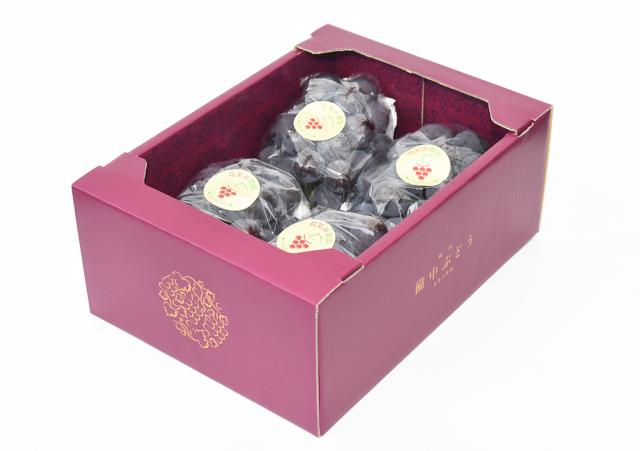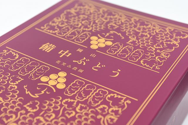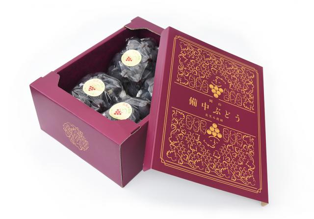 フルーツ王国と呼ばれる岡山県の県北にある真庭市で、生産されている大粒のぶどう。そのぶどうにふさわしいオリジナルのデザイン箱を制作しました。箱のみの内側には、ぶどうの模様が入っていて、商品を取り出した後も華やかな箱として存在感を出しています。